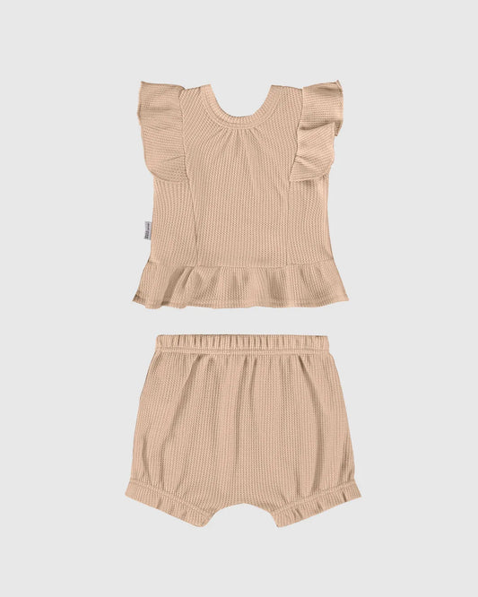 Conjunto Infantil Malha Texturizada com Babado Bege