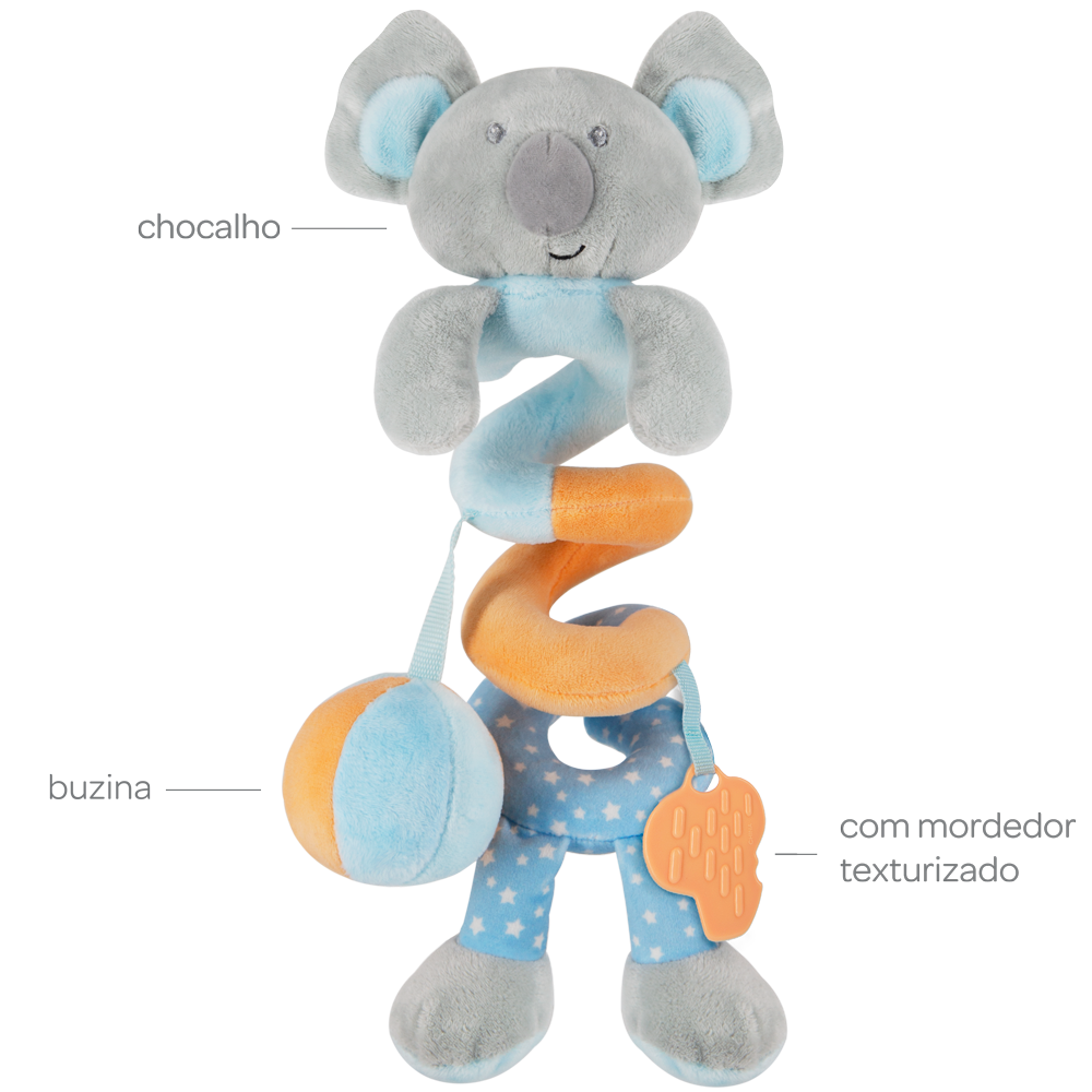 O Bichinho Mola Coala Azul da Buba é ideal para entreter e desenvolver os sentidos do bebê. Macio com mordedores, som de chocalho e tons suaves, estimula o tato, a audição e a visão dos pequenos.