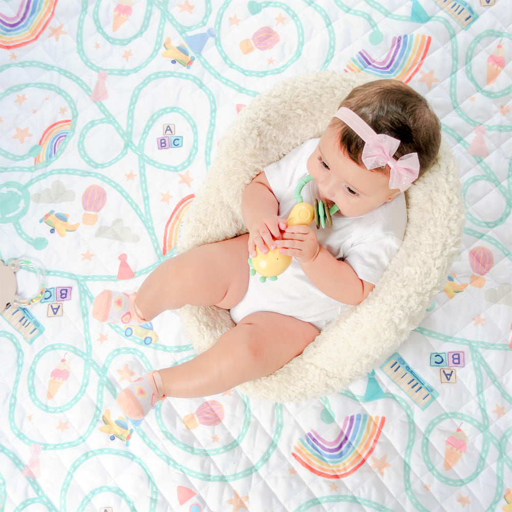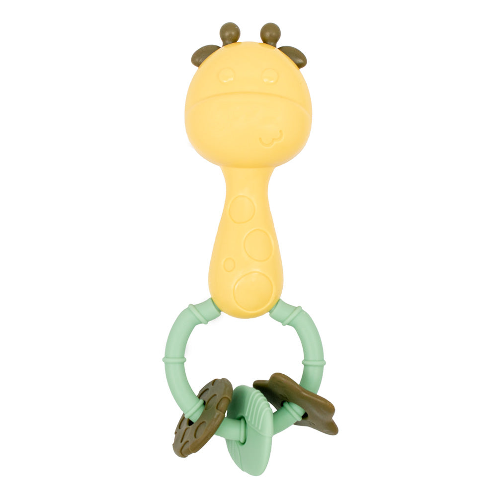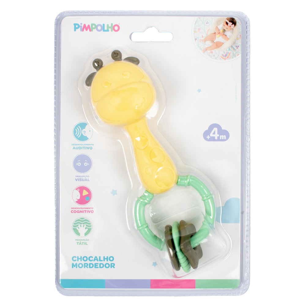 O Chocalho Mordedor Girafa Pimpolho alivia os desconfortos causados pelo nascimento dos primeiros dentinhos. Possui argolas super macias para a mordedura do bebê, e bolinhas que emitem sons quando é chacoalhado.