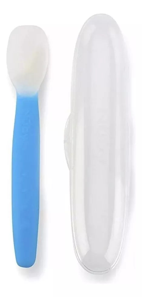 Colher de Silicone da Nuby, em 100% silicone soft flex, super macia, acompanha um estojo higiênico para levar em viagens e passeios. O silicone macio é perfeito para as gengivas sensíveis do bebê e os novos dentinhos. A ponta da tem o formato ideal para a introdução da quantidade exata de alimentos e permite limpar o excesso em torno da boca do bebê.