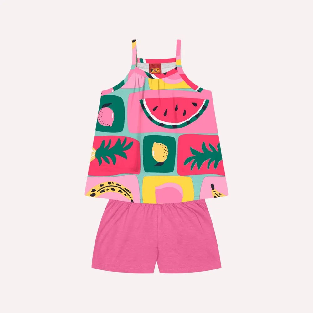 Os detalhes encantadores incluem uma regata com alças finas, gola com franzido na frente e uma estampa rotativa colorida. O short é liso, em um tom que complementa perfeitamente a regata.