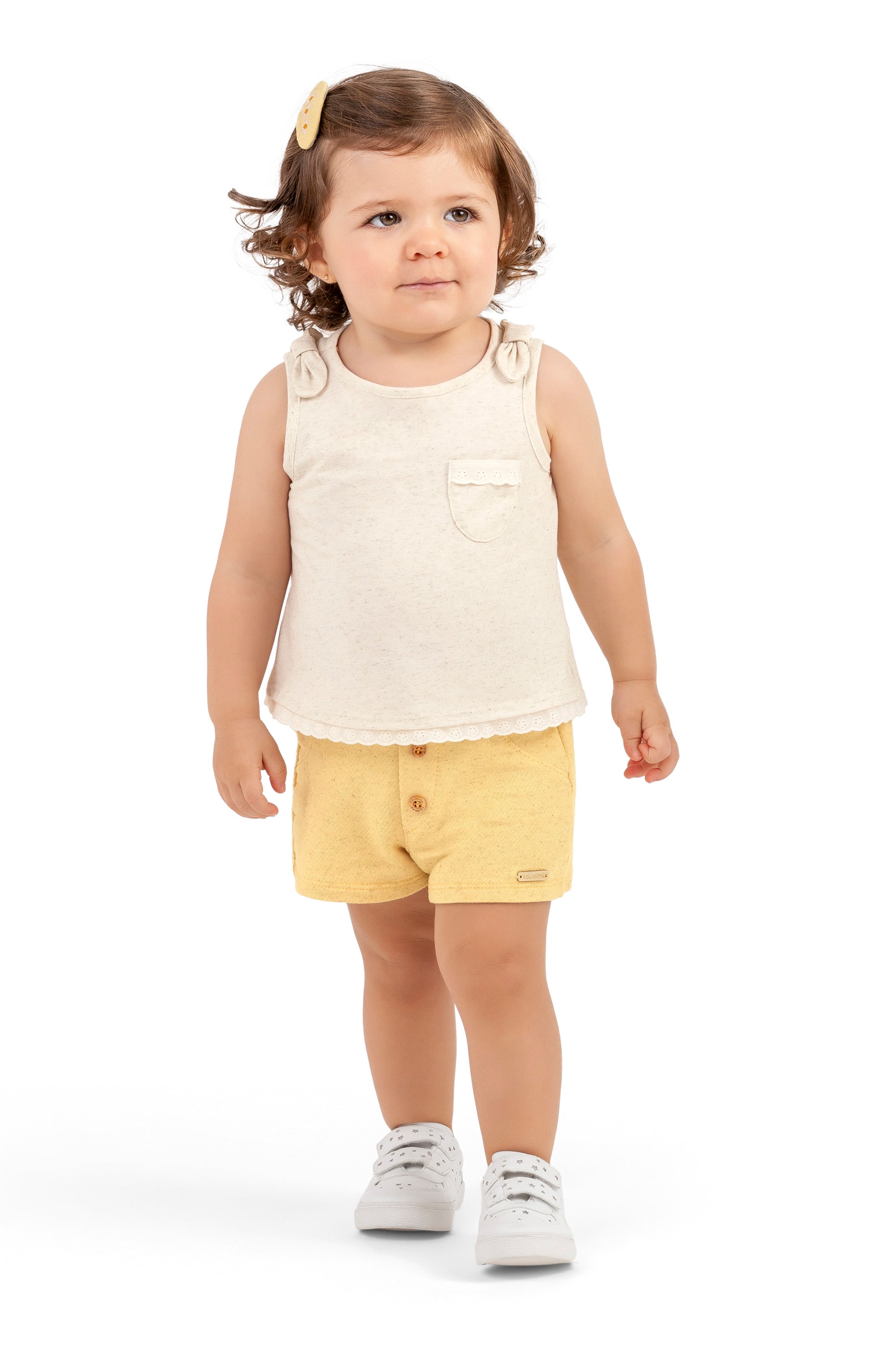 Conjunto Infantil Coloritta – Elegância e conforto para as meninas! Esse conjunto encantador é composto por uma regata na cor nude, com delicados detalhes em rendinha no bolsinho e na barra, além de um laço charmoso no ombro. Feita com 74% algodão e 16% poliéster, a peça oferece maciez e leveza para os dias de calor. O conjunto acompanha um shorts superconfortável, com botões frontais, confeccionado em uma mistura sofisticada de 48% viscose, 20% algodão, 20% poliéster, 9% linho e 3% elastano, garantindo um toque suave e um caimento perfeito. Ideal para passeios ou eventos especiais!
