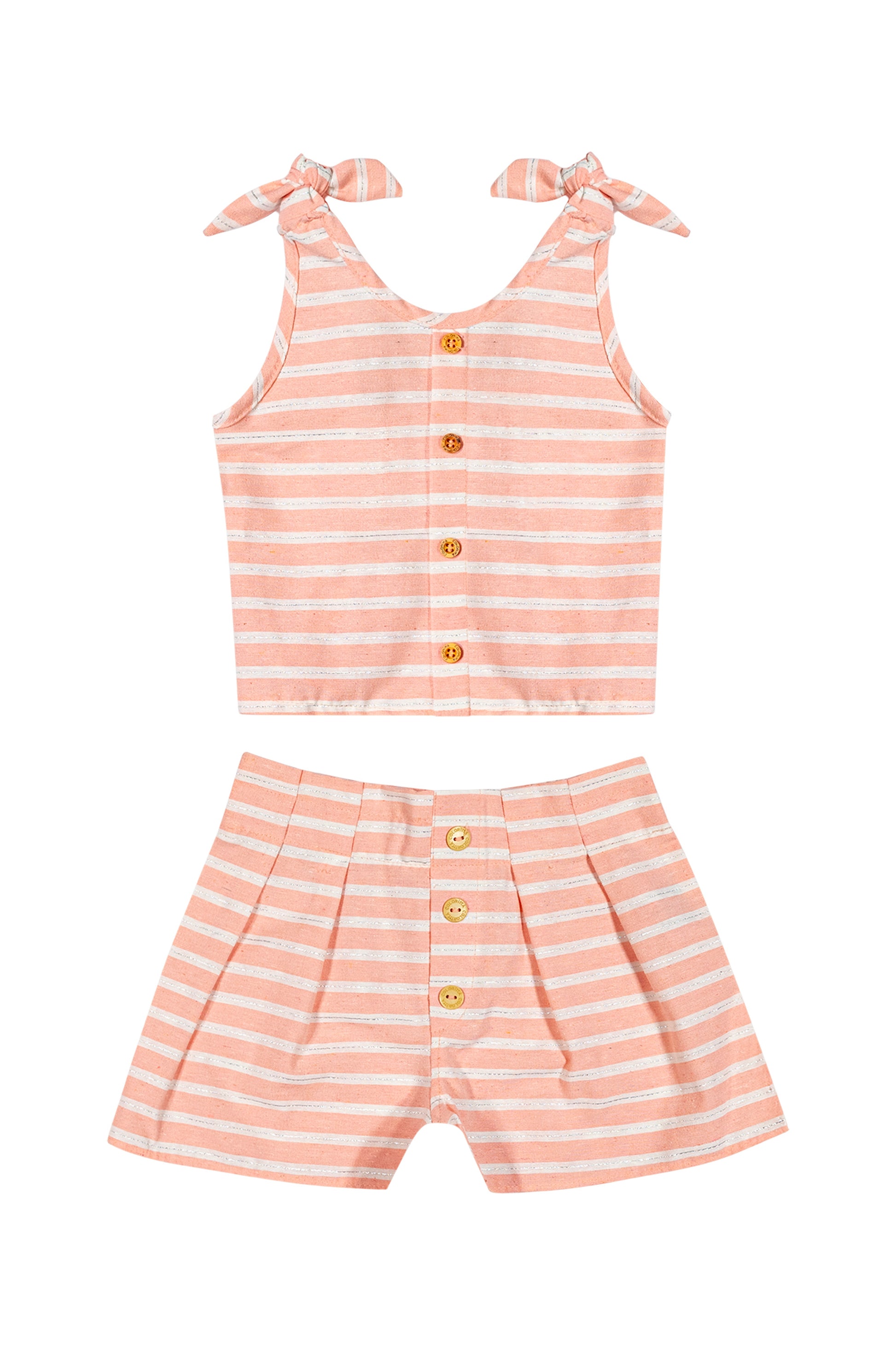 Conjunto Infantil Coloritta – Perfeito para dias cheios de estilo e brilho! Esse lindo conjunto na cor rosa com listras brancas e detalhes com brilho é composto por uma blusa com laço ajustável nos ombros e botões frontais que garantem um toque delicado e funcional. Acompanha um shorts na mesma estampa de listras, com botões frontais que dão um charme especial. Feito 100% de fibras diversas, o conjunto oferece conforto e flexibilidade para as meninas brincarem e se divertirem com estilo em qualquer ocasião.