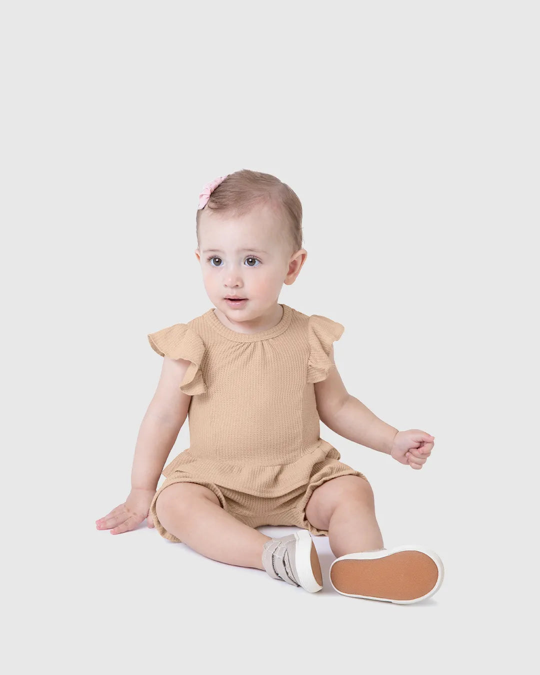 Conjunto Infantil Malha Texturizada com Babado Bege