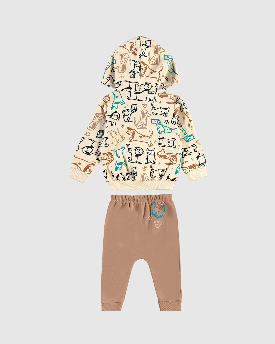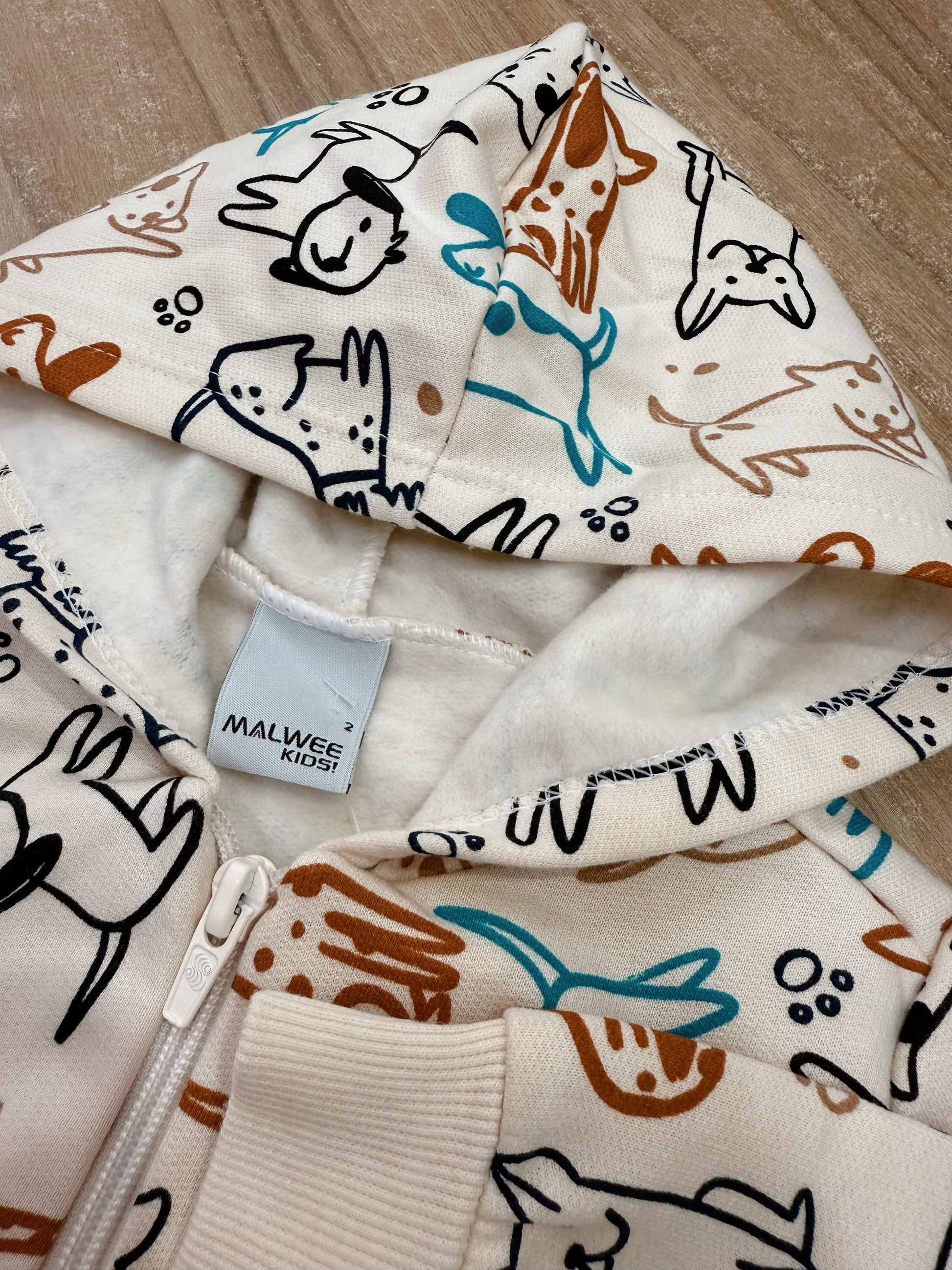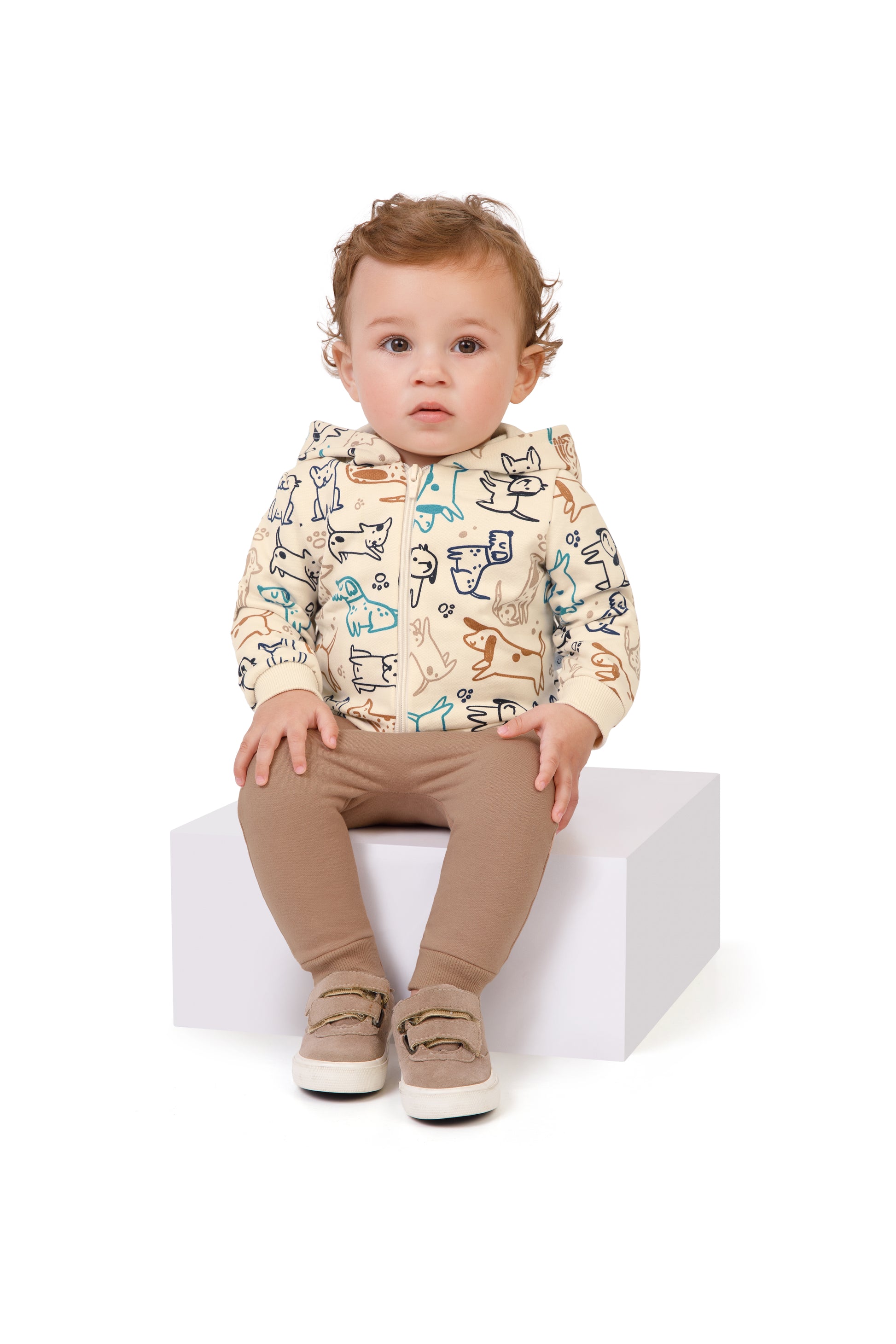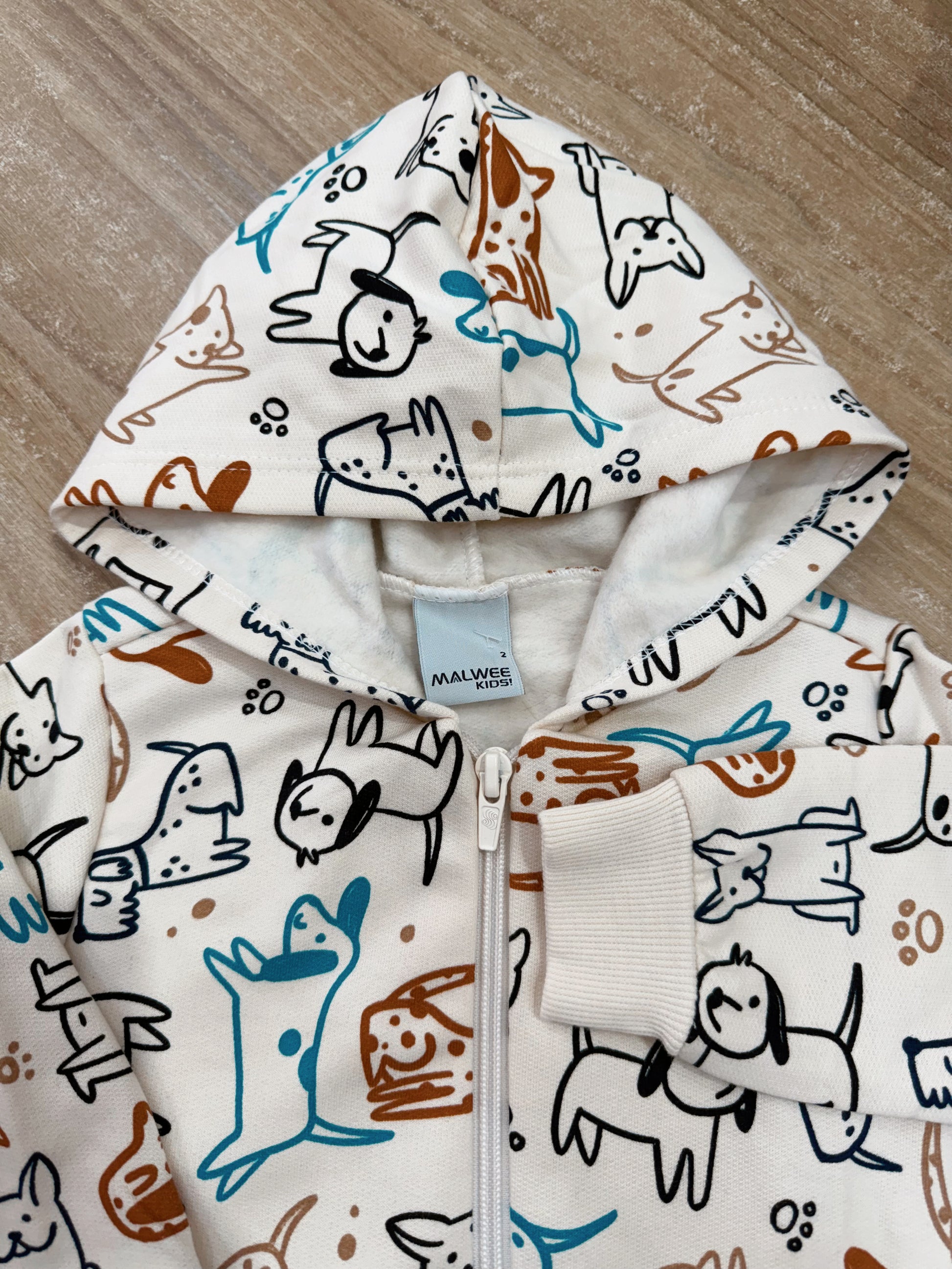 Muita fofura, conforto e estilo para os dias fresquinhos! Esse conjunto da Malwee Kids é ideal para os pequenos que adoram looks divertidos e confortáveis. A jaqueta em moletom com capuz protege do vento com muito charme, enquanto a calça saruel garante liberdade de movimentos para brincar, passear e curtir com a família. A estampa de cachorrinhos dá o toque especial que vai encantar mamães e bebês!
