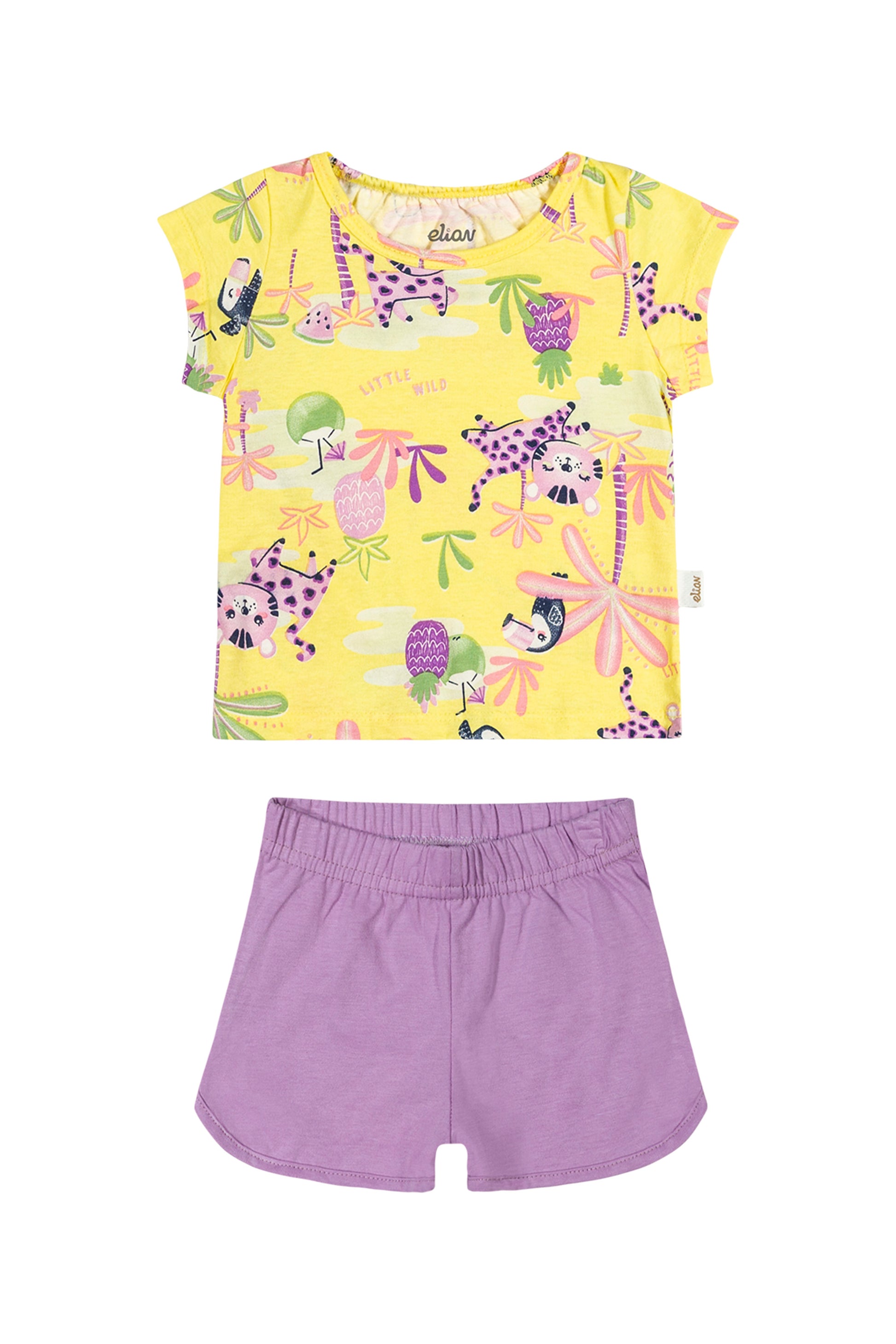 Conjunto Infantil Safari – Feito para meninas explorarem com estilo e conforto! Esse lindo conjunto é composto por uma blusa com estampa Safari em vibrante cor Amarela, combinada com shorts Lilás, ambos feitos 100% em algodão de alta qualidade. O tecido macio e leve proporciona liberdade de movimento, ideal para as aventuras do dia a dia. Perfeito para os dias ensolarados, une diversão e conforto em um visual encantador!