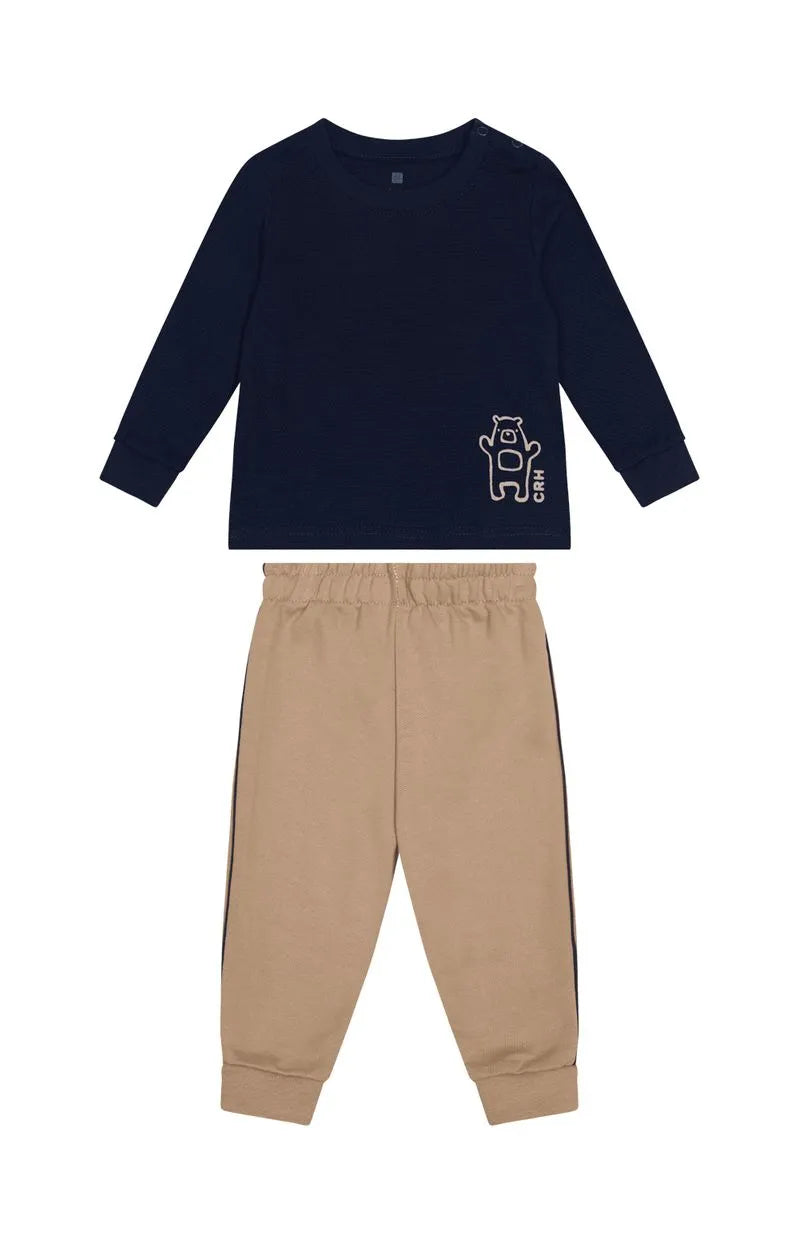 Conjunto confeccionado em malha favo e moletom. A Camiseta possui decote redondo, mangas longas e abertura ombro com fecho por botão de pressão. A calça Jogger conta com cós elástico e filete lateral. Aposte!