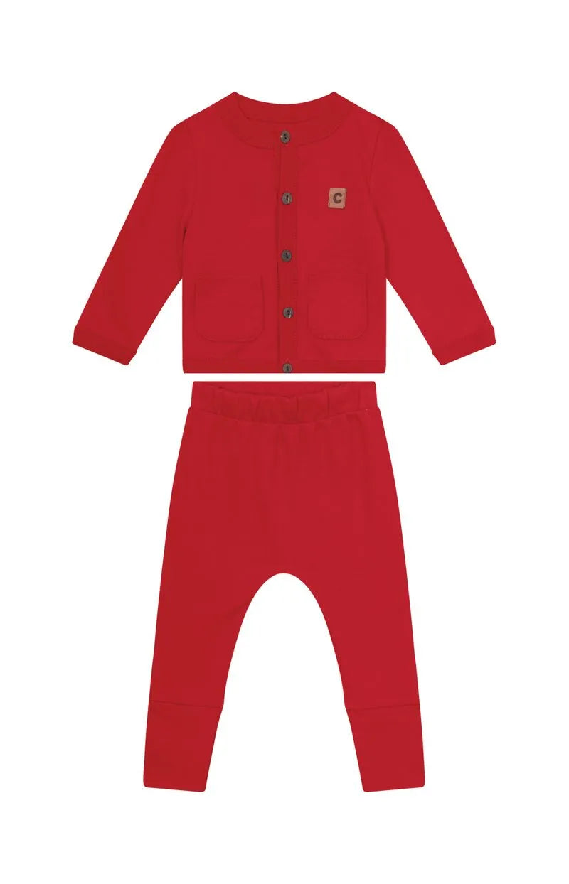 Conjunto Unissex Cardigan Abotoamento Frontal Em Suedine Vermelho