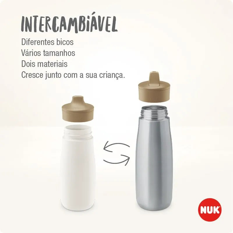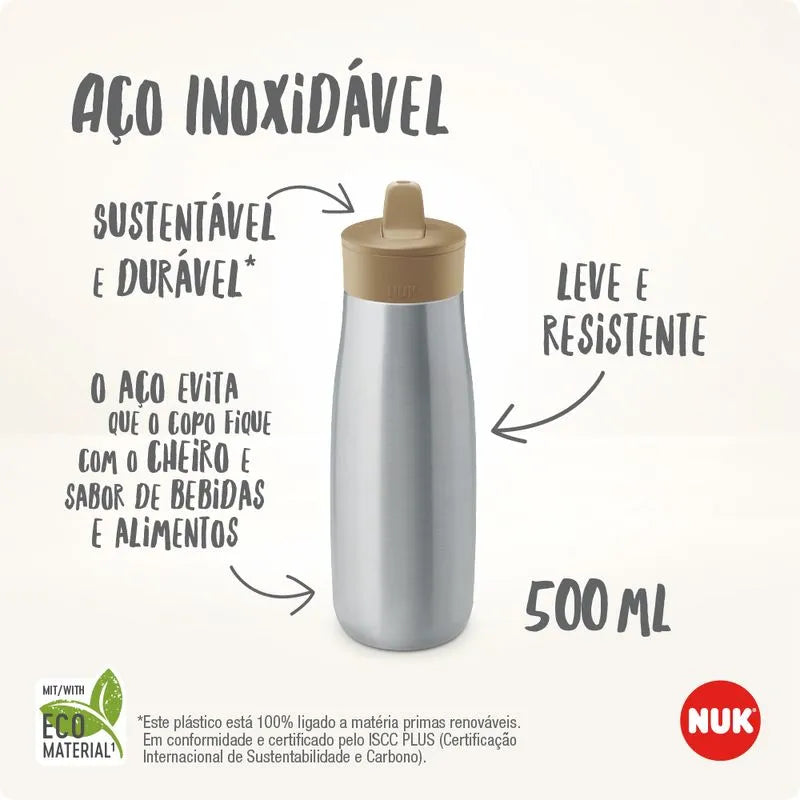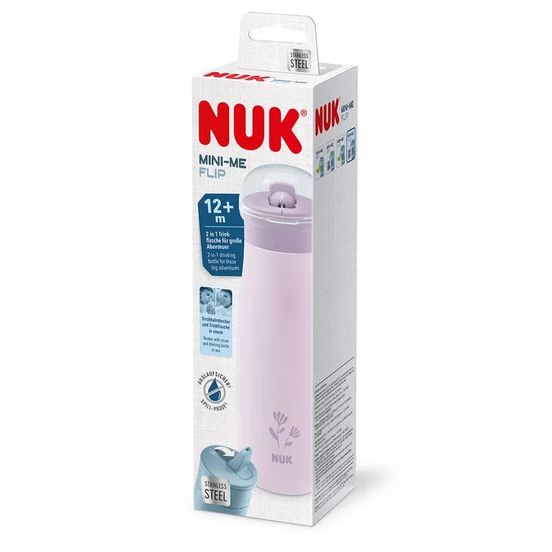 O Copo Mini-Me Flip Inox da Nuk foi cuidadosamente projetado com um design ergonômico e inovador em aço inoxidável de parede única, resistente e durável.