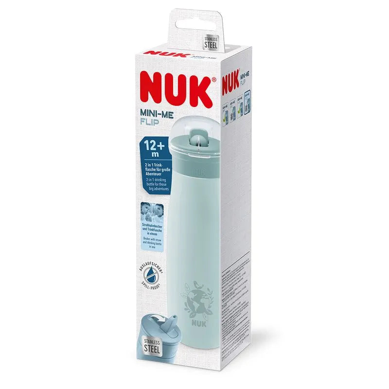 O Copo Mini-Me Flip Inox da Nuk foi cuidadosamente projetado com um design ergonômico e inovador em aço inoxidável de parede única, resistente e durável.