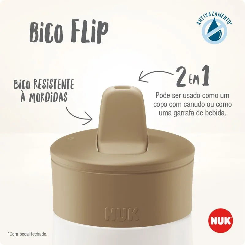 Ele possui Bico Flip com sistema aberto e fechado, é super resistente a mordidas, é antivazamentos e pode ser usado tanto como um copo com canudo ou como uma garrafa sem o canudo. Além disso, é fácil de higienizar e conta com tampa protetora higiênica para transporte com sistema de clique simples para abertura e fechamento.