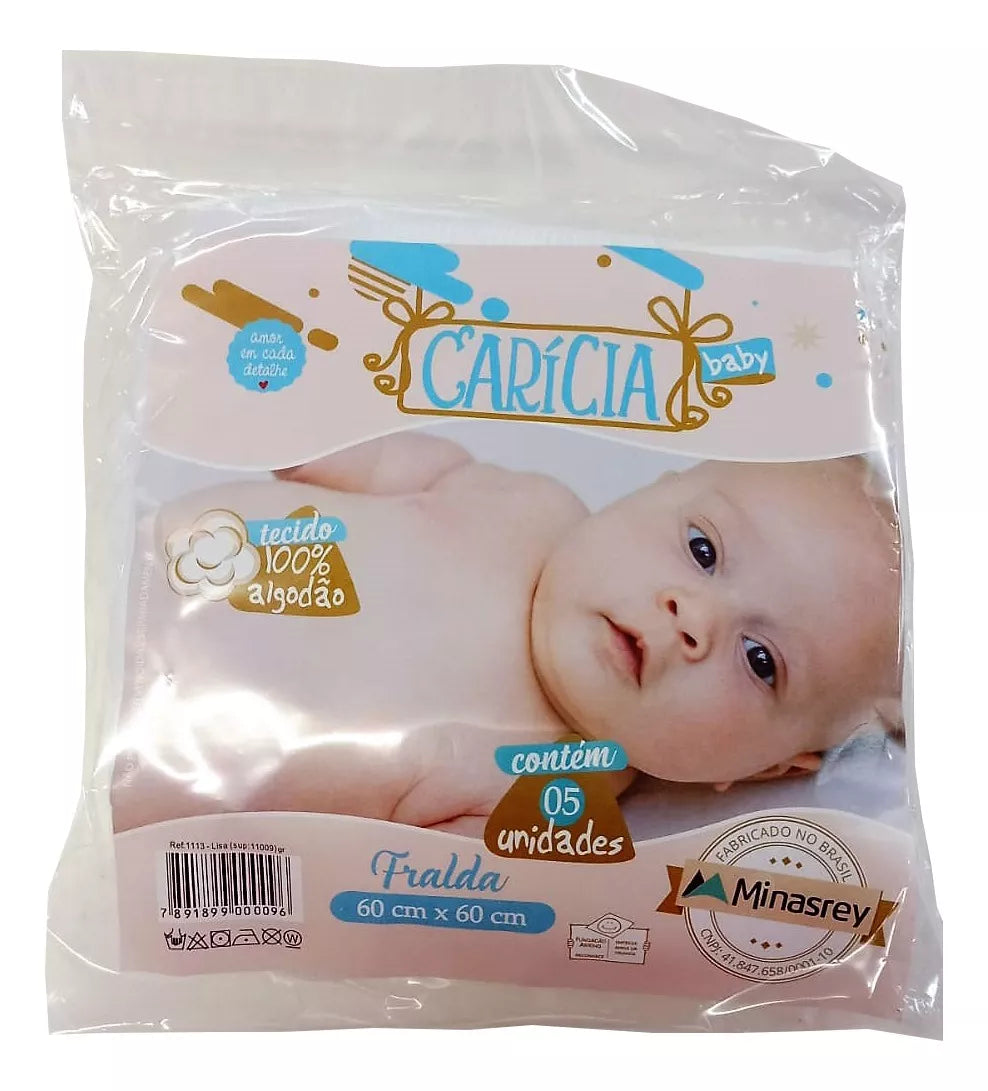 A Fralda de Pano com 5 unidades da Caricia Baby é feita em tecido duplo 100% algodão, o que proporciona conforto e maciez a pele do bebê. Seu tamanho de 60cm x 60cm é excelente, pois possibilita inúmeras utilizações como: fraldinha para cochilar, fraldinha de ombro, fraldinha para proteger no bebê conforto ou carrinho, para forrar qualquer superfície quando necessário, entre outros.