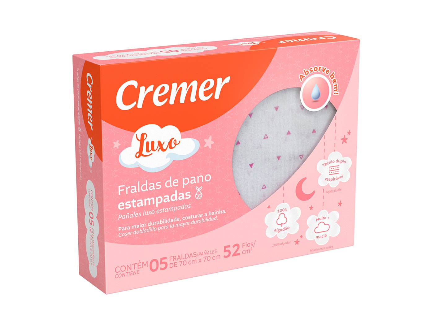 As Fraldas Estampadas Cremer reúnem a leveza de tecido 100% algodão e lindas estampas sublimadas para completar o enxoval do seu bebê. Tem um toque suave e macio e completa o enxoval do seu bebê. A linha Luxo da Cremer tem como principais ingredientes: cuidado, dedicação e muito carinho na criação e desenvolvimento de produtos para bebês.