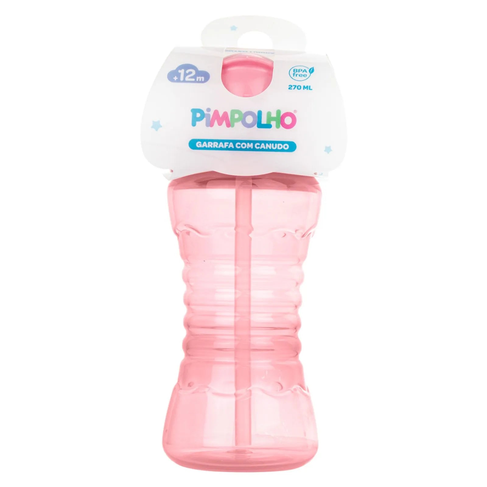 Garrafa com Canudo de Silicone da Pimpolho, que não machuca a boca e se recolhe para dentro da tampa quando fechada, evitando respingos.