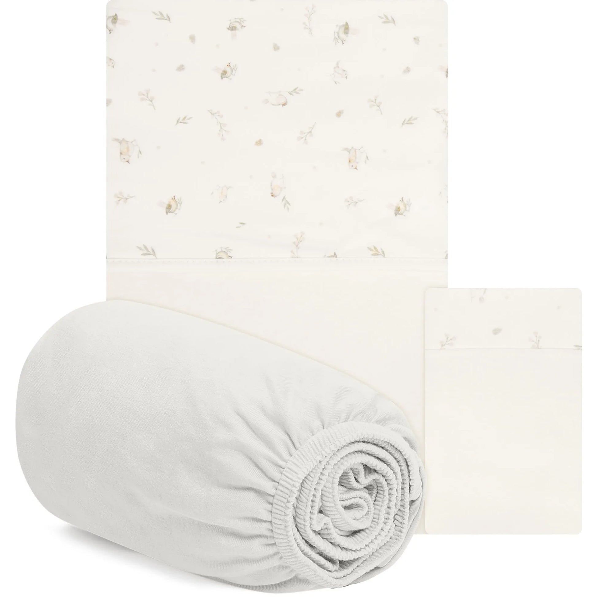 O Jogo de Lençol 03 peças Hug traz conforto e cuidado para o quartinho do bebê. O kit possui um lençol de elástico, uma fronha e um sobre lençol com vira em suedine estampado. Além disso, o sobre lençol é ótimo para cobrir o bebê. Indicado para berço padrão americano.