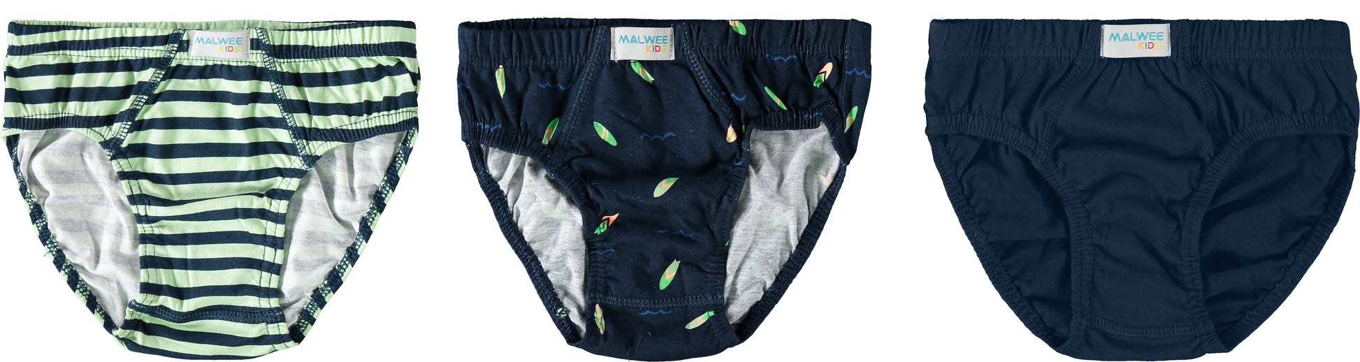 Kit de Cuecas Infantis Malwee confeccionadas em malha 100% algodão. Na modelagem Slip, as peças contam com cós aplicado em elástico e etiqueta decorativa no frontal. O kit possui 3 variações, sendo: duas cuecas estampadas e 1 básica lisa. Para total conforto dos pequenos!