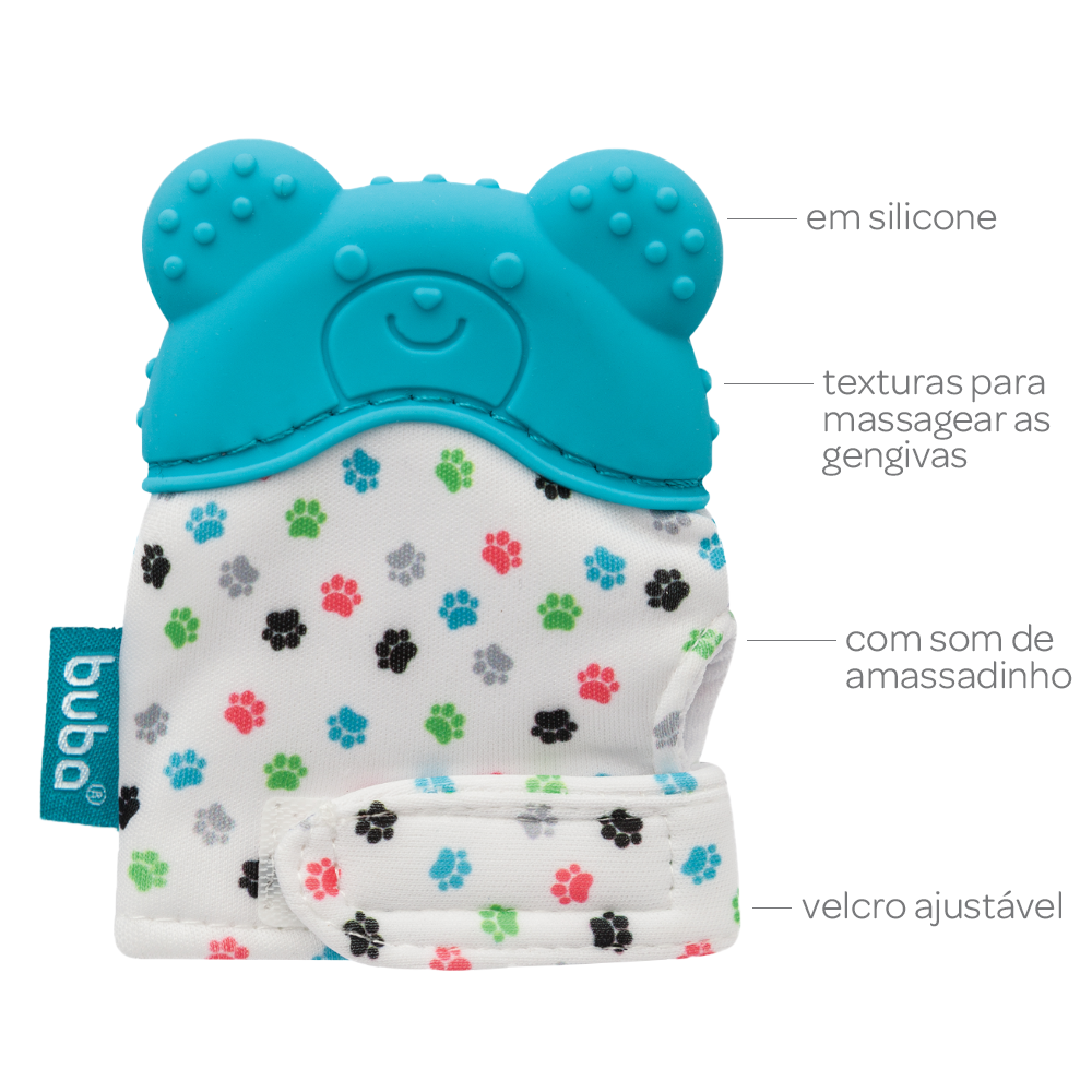 A Luvinha Mordedor Urso da Buba foi desenvolvida para os bebês que levam tudo à boca e para aqueles que estão na fase da dentição. Sua ponta de silicone com textura macia faz uma massagem suave na gengiva da criança, quando ela a põe na boca aliviando as dores causadas pelos primeiros dentinhos. Ela também estimula os sentidos através das cores e o barulho de amassadinho. O fecho em velcro faz com que a luvinha se encaixe perfeitamente para que não escorregue da mão do pequeno, protegendo o bebê da mastigação. Livre de BPA. A linha Buba Baby traz itens pensados com muito carinho para o seu bebê. Através de cores, formas e texturas, estimula todos os sentidos, contribuindo para o crescimento saudável da criança.