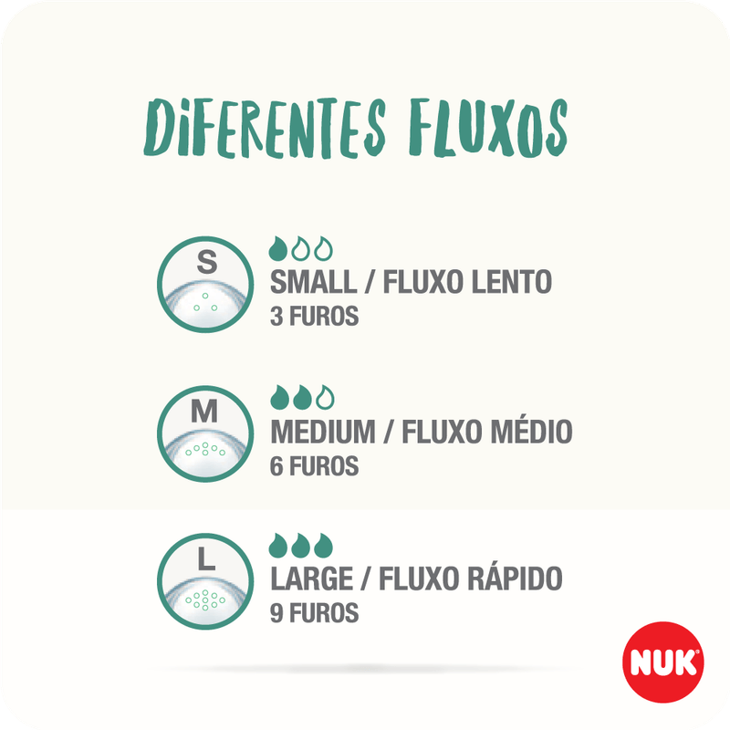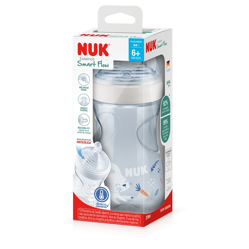 A Mamadeira Anticólica NUK Essence Smart Flow possui bico com tecnologia inovadora composta por sistema de fluxo de líquidos com múltiplos furos, que