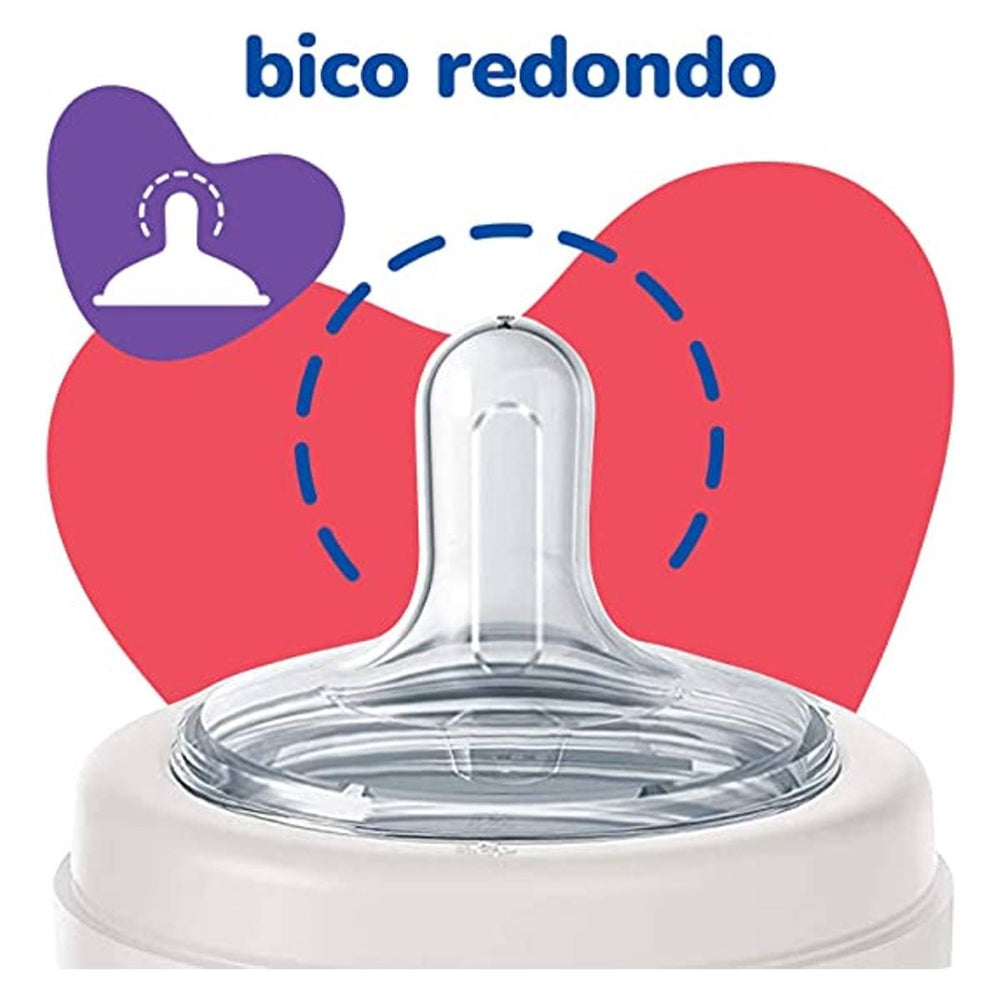 O bico redondo em silicone macio e flexível contém uma área maior de apoio para os lábios durante a alimentação proporcionando um toque suave.