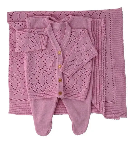 Kit Saída Maternidade Manta, Macacão e Casaco Jacquard - Rosa
