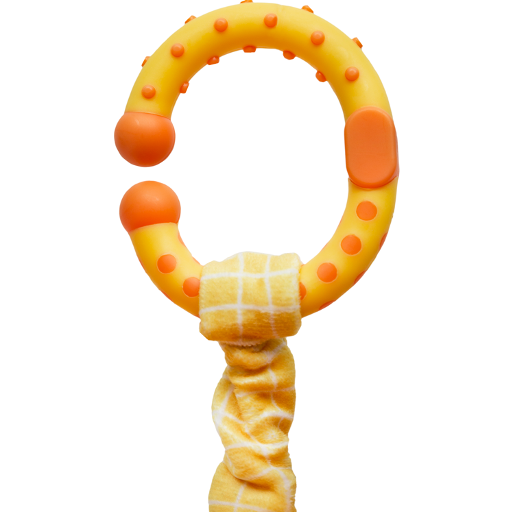 Tecido: 100% Poliéster; Chocalho 100% EVA; Cabide 75% Polipropileno (PP) e 25% Acetato-Vinilo de Etileno (EVA); Mordedor 100% Acetato-Vinilo de Etileno (EVA) e Anel 100% Acritonitrila Butadieno Estireno (ABS)
